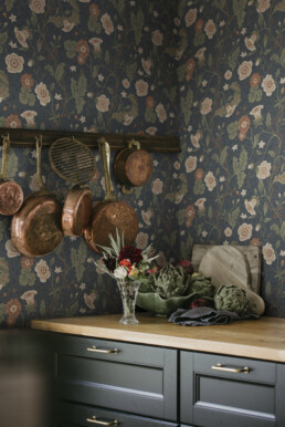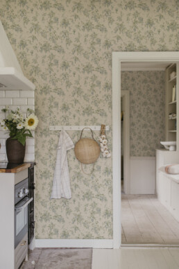 Väga võluva tulemuse annab tapeedi kasutamine avatud riiulite ja klaasvitriinide taustal.