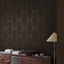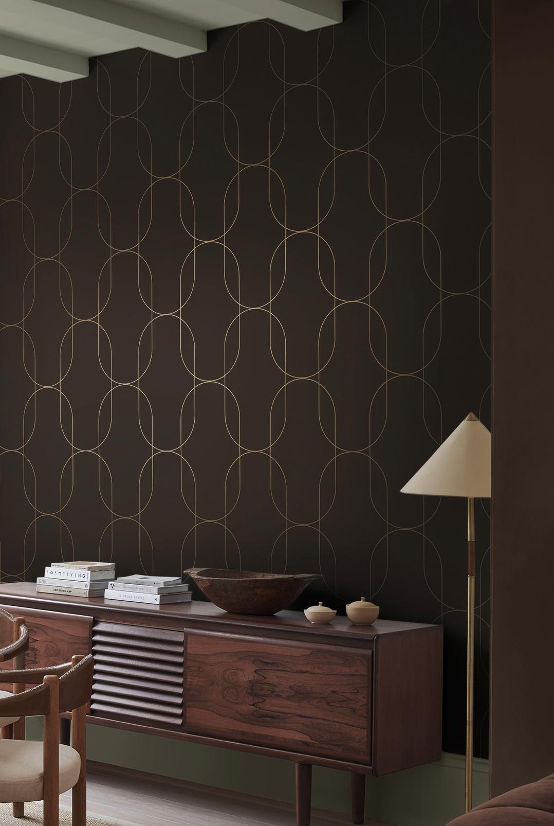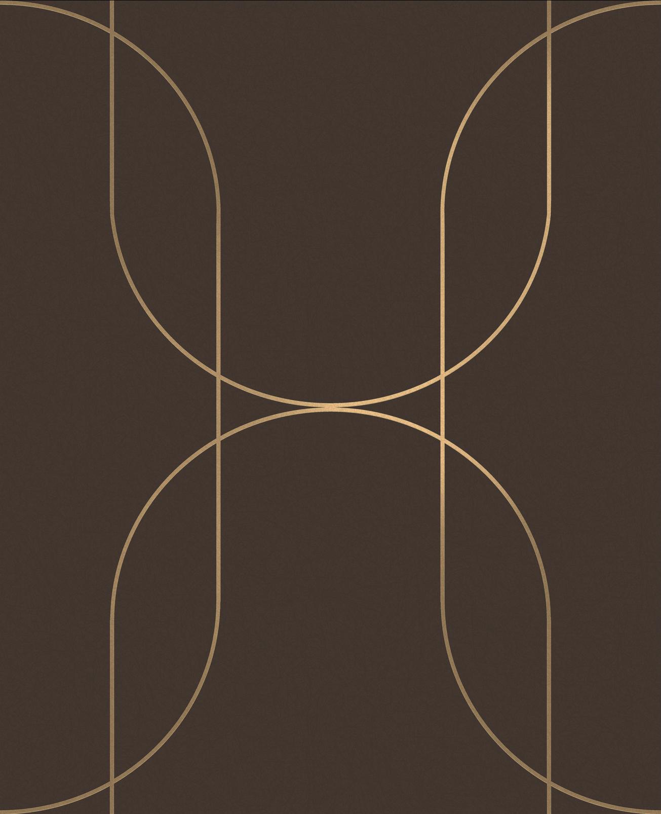 Moodsa värvipaleti ja stiilse geomeetriaga, on see seinakate ideaalne kutsuva kodu loomiseks. Pehme peen metallikläikega geomeetria ulatub üle sametiselt mati sügava tumepruuni tausta, luues hubase, särava ruumi.