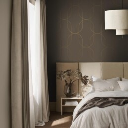 Moodsa värvipaleti ja stiilse geomeetriaga, on see seinakate ideaalne kutsuva kodu loomiseks. Pehme peen metallikläikega geomeetria ulatub üle sametiselt mati kohvpruuni tausta, luues hubase, särava ruumi.