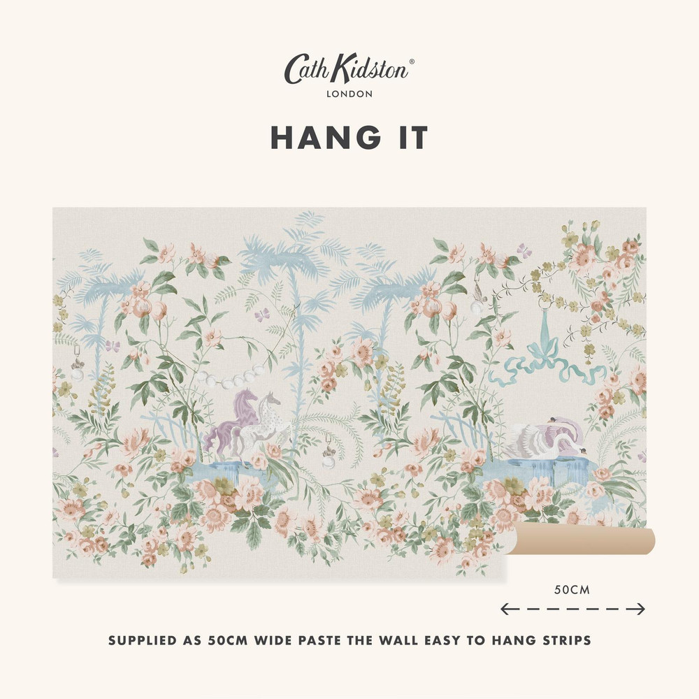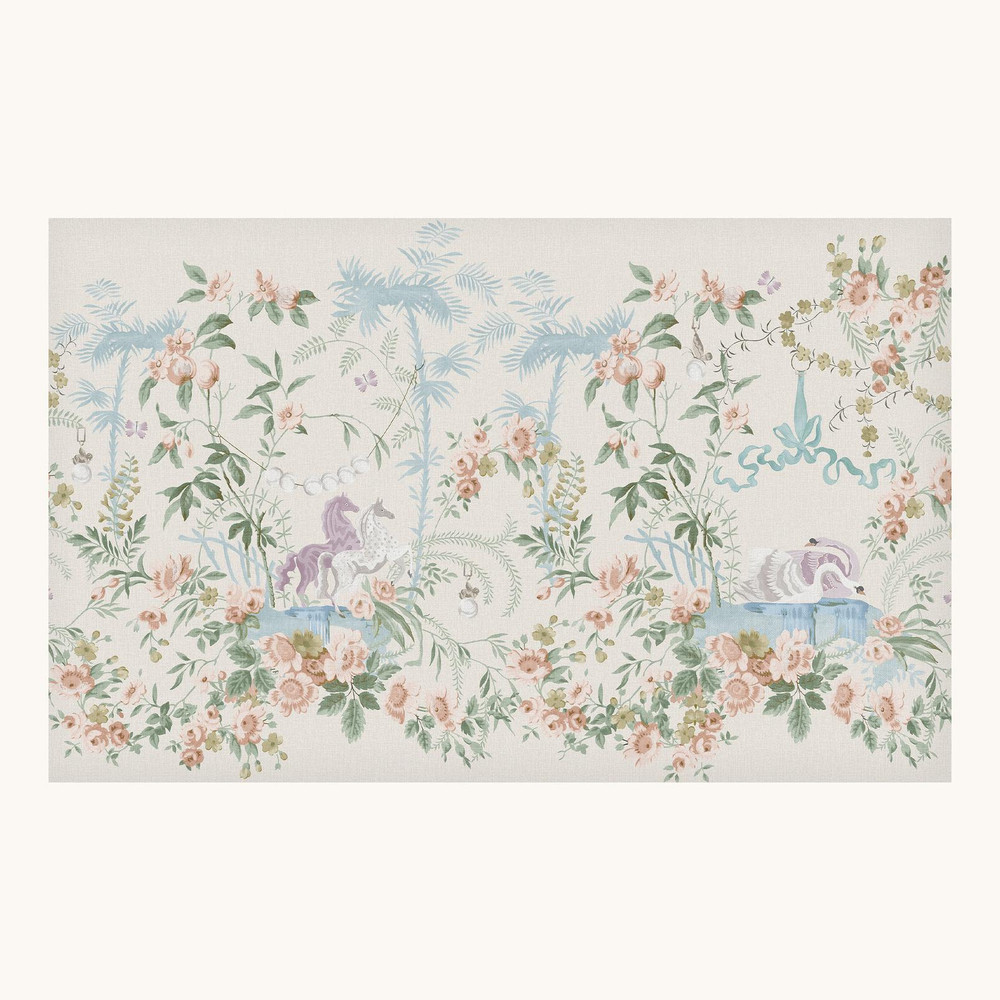 Tõeliselt lummav, müütilist maagiat täis kaunilt ainulaadne seinamaaling, mille helebeežil linasel taustal pojengide ja sõnajalgade vahelt leiab pehme kumaga helendavad pärlid ja graatsilised luiged, mille elegantsed vormid peegelduvad all sätendavas vees. Veest kasvavad heledad helesinised ronitaimed, mis imiteerivad palmipuude välimust ja varjutavad majesteetlikke hobuseid, kes uhkelt kujunduse keskel seisavad. Kokkuvõttes loob see vaatepildi, mis äratab imetlust, elegantsi ja fantaasiat.