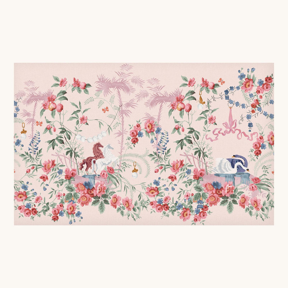 Tõeliselt lummav, müütilist maagiat täis kaunilt ainulaadne seinamaaling, mille roosal taustal pojengide ja sõnajalgade vahelt leiab pehme kumaga helendavad pärlid ja graatsilised luiged, mille elegantsed vormid peegelduvad all sätendavas vees. Veest kasvavad heledad helesinised ronitaimed, mis imiteerivad palmipuude välimust ja varjutavad majesteetlikke hobuseid, kes uhkelt kujunduse keskel seisavad. Kokkuvõttes loob see vaatepildi, mis äratab imetlust, elegantsi ja fantaasiat.