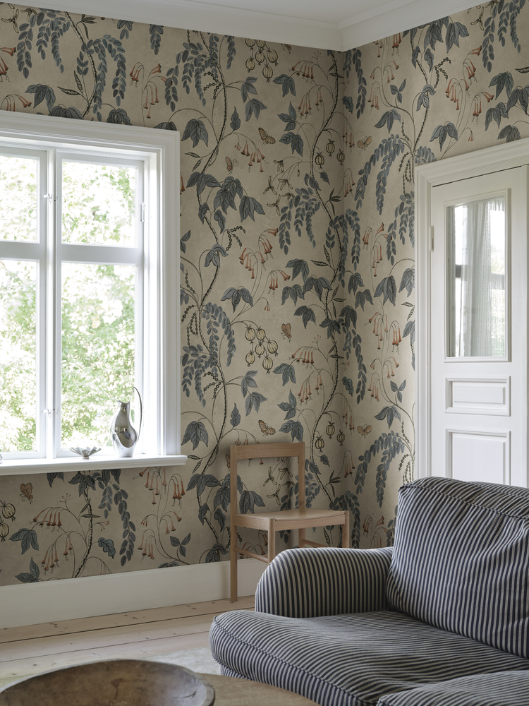 See tapeet toob koju elegantse aia hõngu oma keeruka botaanilise mustriga, mis sisaldab õrnu lehti ja õisi, luues rahuliku ja külalislahke atmosfääri, mis sobib ideaalselt loodusest inspireeritud ilu lisamiseks igasse ruumi.