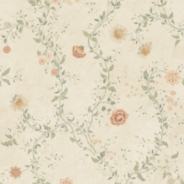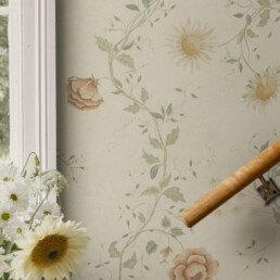 Õrn käsitsi maalitud pastelltoonides lilleline sümfoonia millel päevalilled, daaliad, puitastrid ja magusad herned põimuvad vastu ilmastikust puretud kivipinda, luues kauni kaasaegse vintage välimuse.