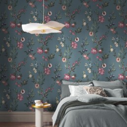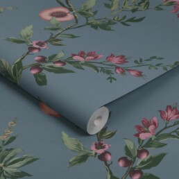 Orgaaniliste lopsakate lehtede ja julgete puuviljamotiivide kombinatsioon loob elujõust pakatava värskendava ja elava atmosfääri. Mälestustest tulvil aed on romantiline austusavaldus botaanilisele ilule, kus rippuvad lilled ja küpsed viljapuuaia viljad põimuvad pehmel, vintage hõngulisel taustal. Virsikud, ploomid ja granaatõunad ripuvad viinapuude küljes, ümbritsetuna õrnadest õitest punakates, kreemikates ja violetsetes toonides. Maaliline stiil annab käsitsi viimistletud võlu, justkui oleks iga õis pressitud vanast botaanilisest visandiraamatust. Õrn sinakas alus toob soojust ja värskust, tasakaalustades kogu seda küllust rahuliku ja nostalgilise kergusega.