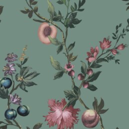 Orgaaniliste lopsakate lehtede ja julgete puuviljamotiivide kombinatsioon loob elujõust pakatava värskendava ja elava atmosfääri. Mälestustest tulvil aed on romantiline austusavaldus botaanilisele ilule, kus rippuvad lilled ja küpsed viljapuuaia viljad põimuvad pehmel, ajaloolisel rohelisel taustal. Virsikud, ploomid ja granaatõunad ripuvad viinapuude küljes, ümbritsetuna õrnadest õitest punakates, kreemikates ja violetsetes toonides. Maaliline stiil annab käsitsi viimistletud võlu, justkui oleks iga õis pressitud vanast botaanilisest visandiraamatust. Õrn roheline alus toob soojust ja värskust, tasakaalustades kogu seda küllust rahuliku ja nostalgilise kergusega.