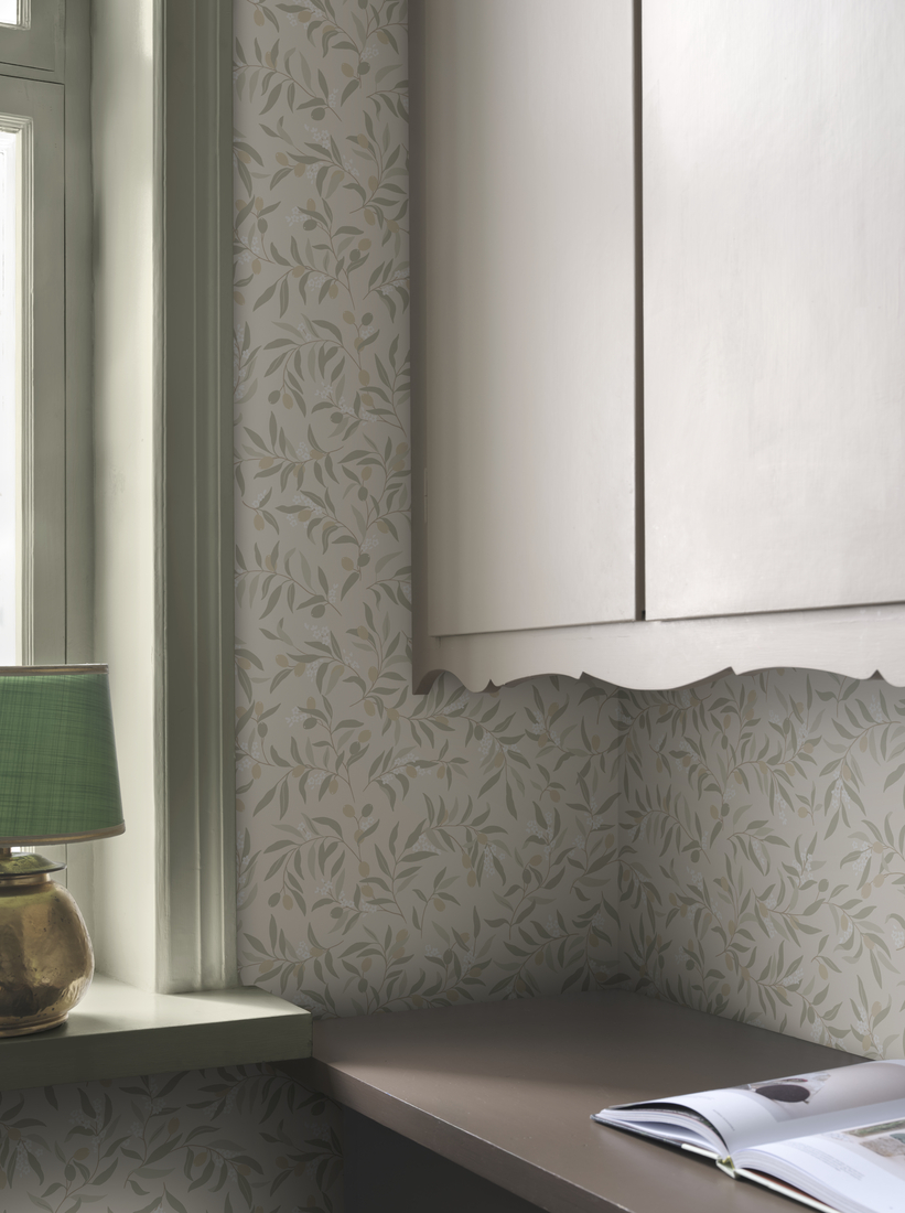 Looklevad oliivioksad soojade oliividega loovad õhulise, samas kaasahaarava tunde. See disain annab ruumile Vahemere võlu ja lopsaka roheluse, pakkudes rahustavat, samas värskusest pakatavat tausta.