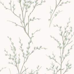 Valgel taustal õrnad salveirohelised pajuurva oksad toovad ruumi lootusrikka varakevadise tunde.