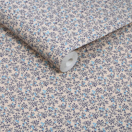 Rahu ja peent võlu pakkuv armas väike tapeedimuster beeži ja tumesinise-helesinise kontrastides.